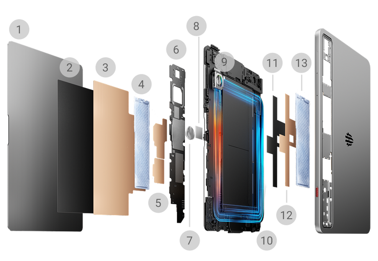 The enhanced 13-layer ICE-X cooling system combines Liquid Metal 2.0, dual-layer sandwich vapor chambers, and a high-speed turbofan. It reduces core temperatures by up to 8°C and improving cooling efficiency by 28%.