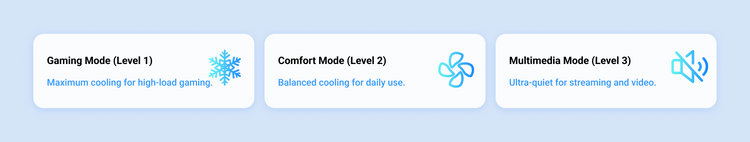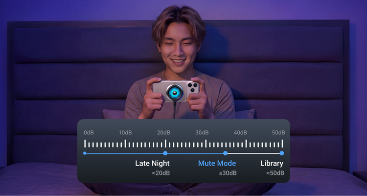 Noise as low as 30dB — meets ISO sleep standards. Enjoy uninterrupted gaming and live streaming.