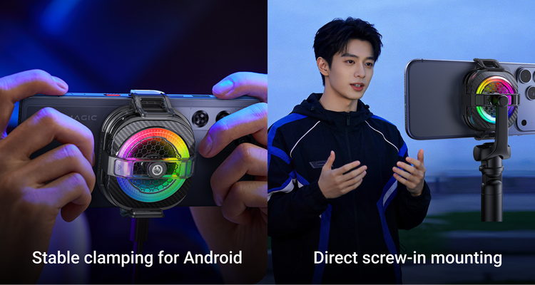 Dedicated Android back clip with 1/4-inch universal thread for direct mounting to tripods and streaming rigs.